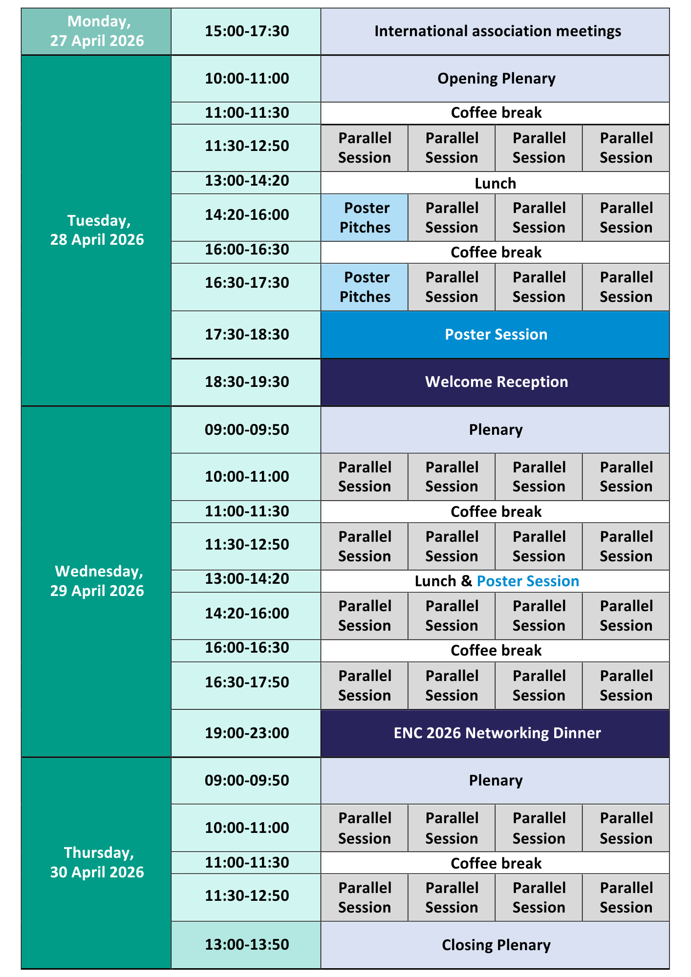 Multiple intervals will be built into the ENC2026 programme, allowing direct interactions between participants and with exhibitors. In addition to the main programme, evening social activities are designed to encourage and foster networking opportunities.